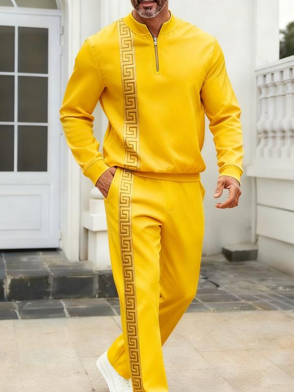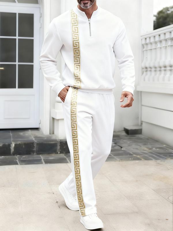 Men's fashionable casual zipper stand up collar long sleeved pants set, polyester fiber material two-piece set, pattern design, elastic waistband, suitable for vacation