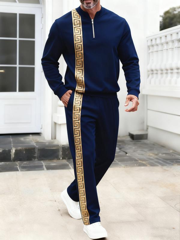 📌Ideal for VacationsMen's fashionable casual zipper stand up collar long sleeved pants set, polyester fiber material two-piece set, pattern design, elastic waistband, suitable for vacation