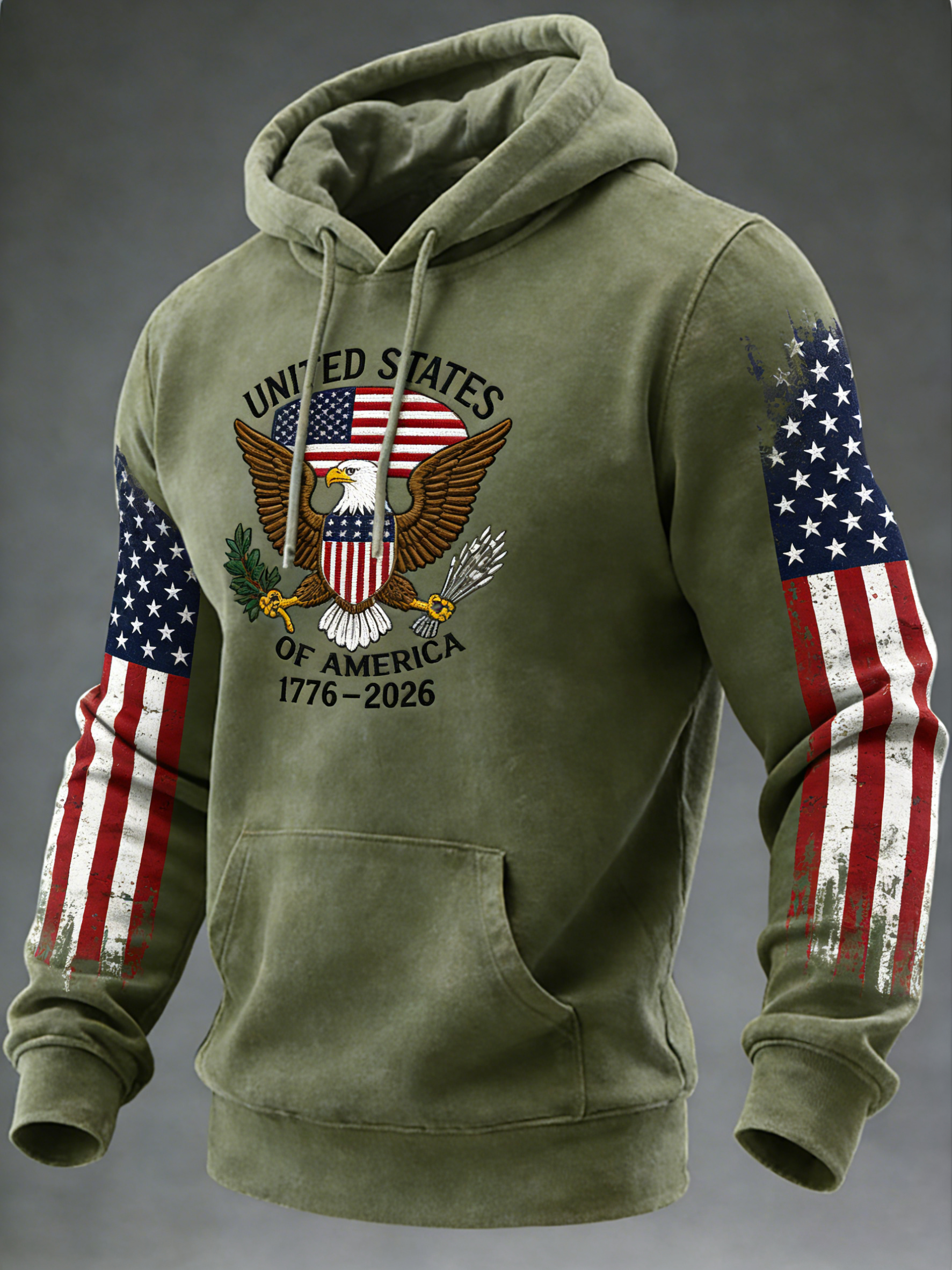 The hoodie features an artistic, irregular American flag pattern on the sleeves, while the rest of the garment is a solid color with a washed effect.  The chest is embroidered with "UNITED STATES OF AMERICA," with the American flag and a bald eagle in the center, and "1776-2026" below.