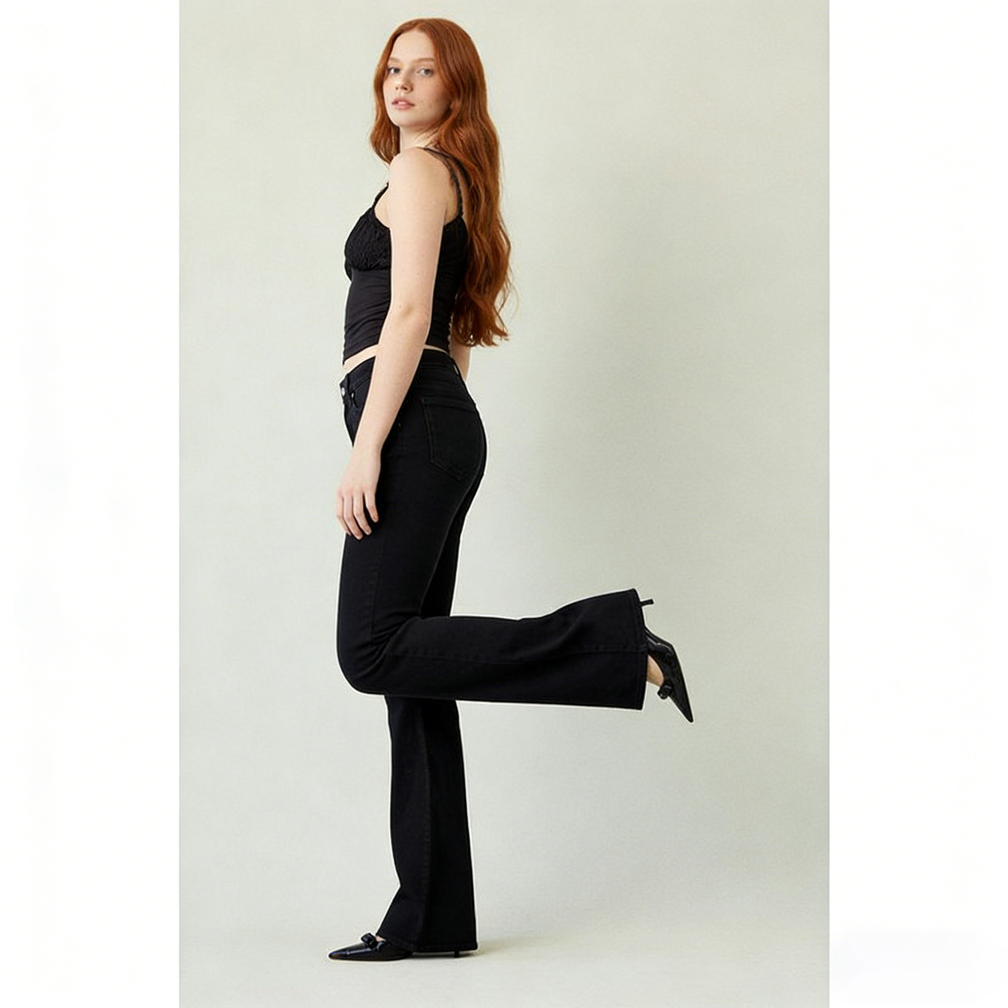 Introducing the Jade Low Rise Bootcut Jeans – your new essential for an effortlessly stylish and flattering look! Designed with a focus on fit and comfort, these black stretch jeans are tailored to elevate your everyday wardrobe.