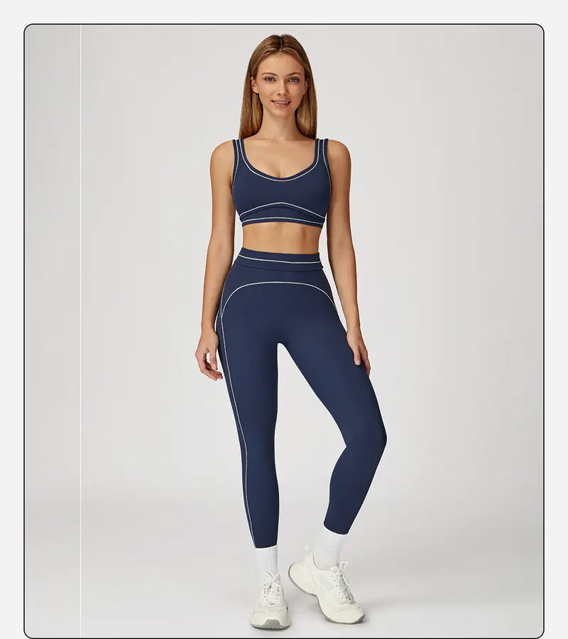 Supportive Silhouette: The sports bra features a double underband and wide shoulder straps for stable support; the high-waisted leggings are shape-fitting to prevent shifting during exercise.