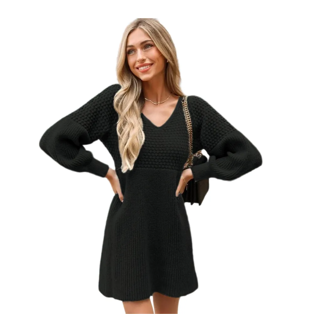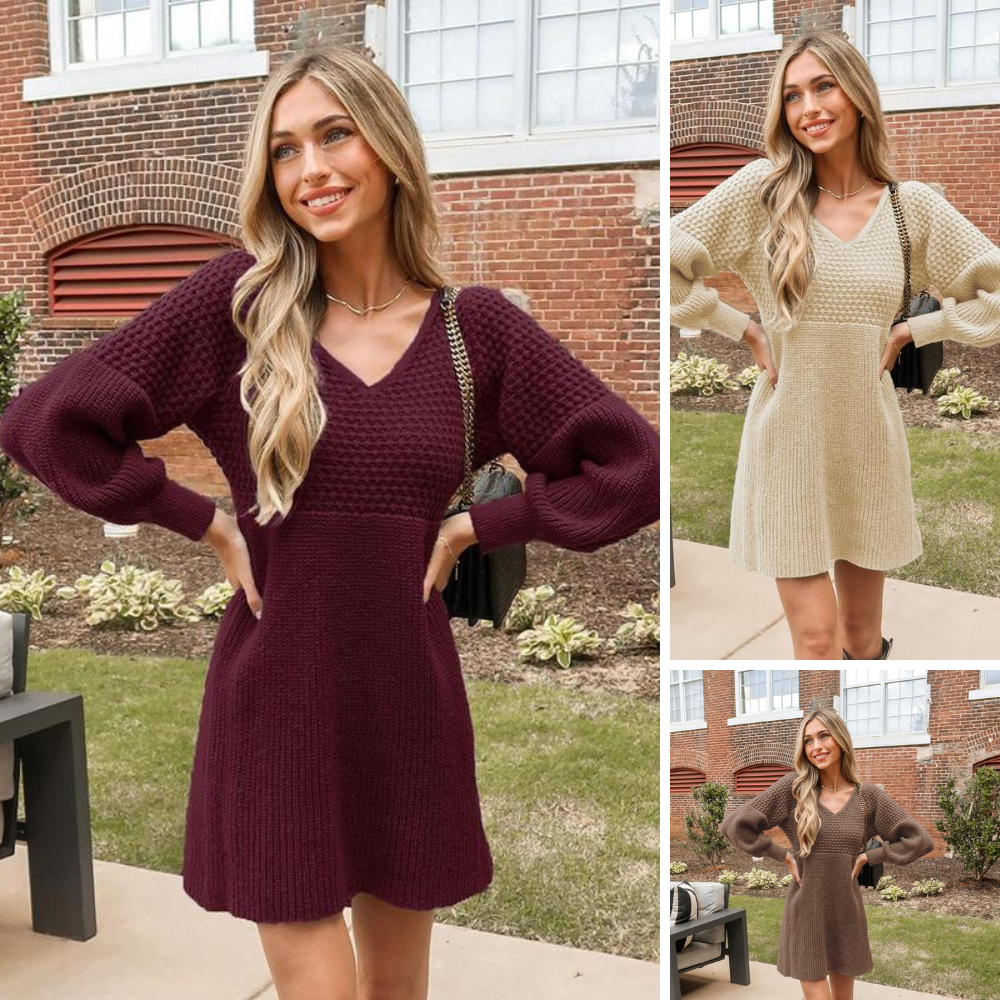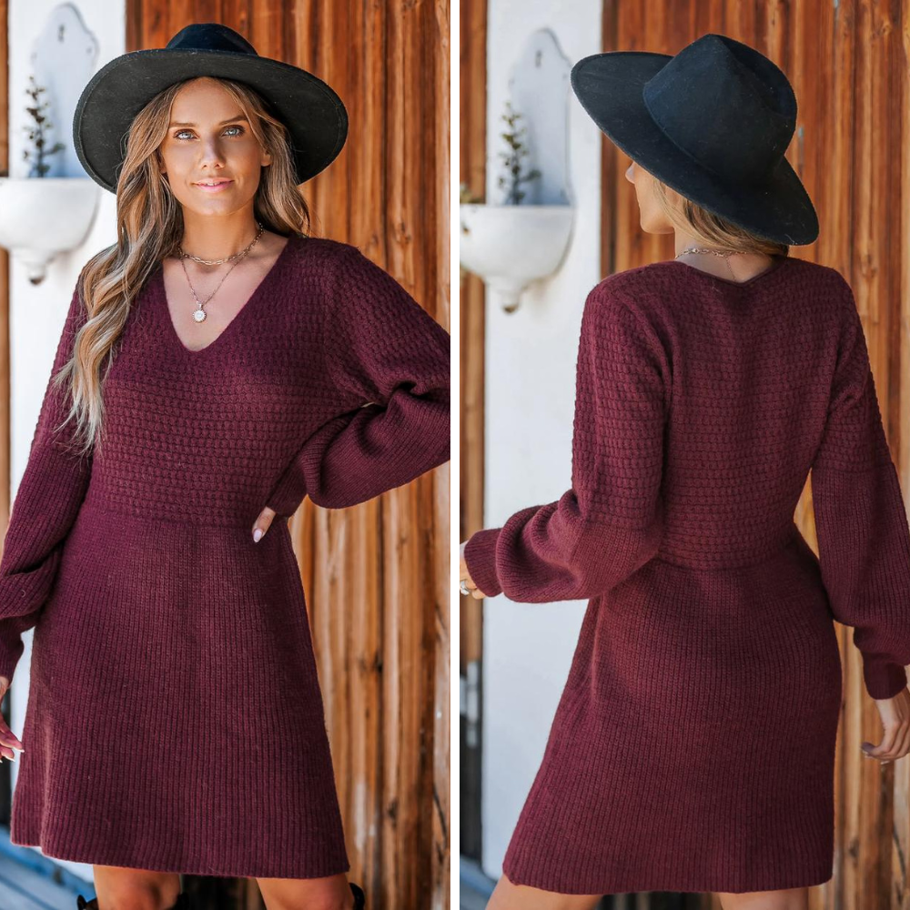 Step into sweet style with our Honeycomb Knit V-Neck Mini Sweater Dress!