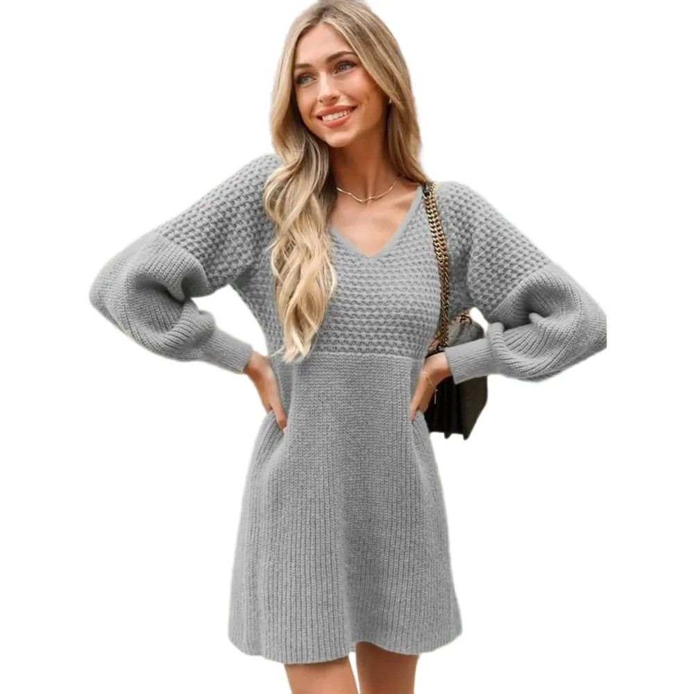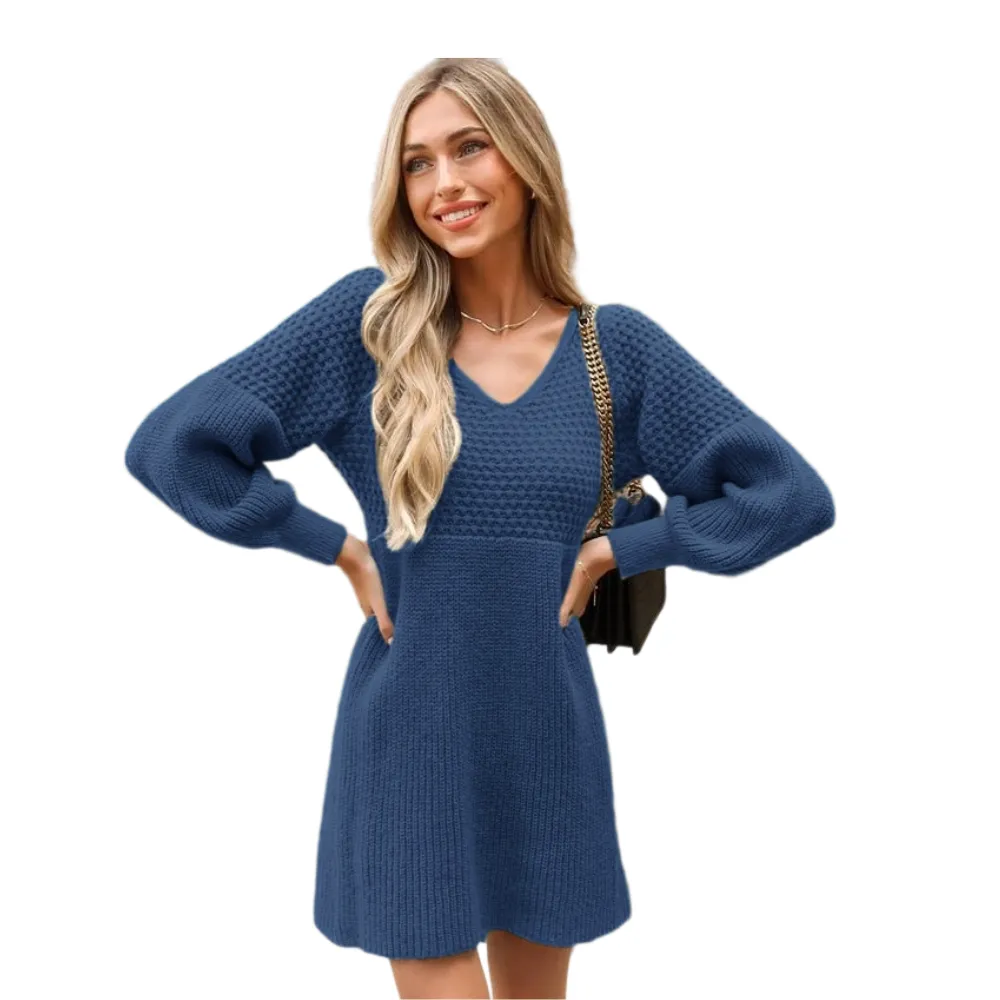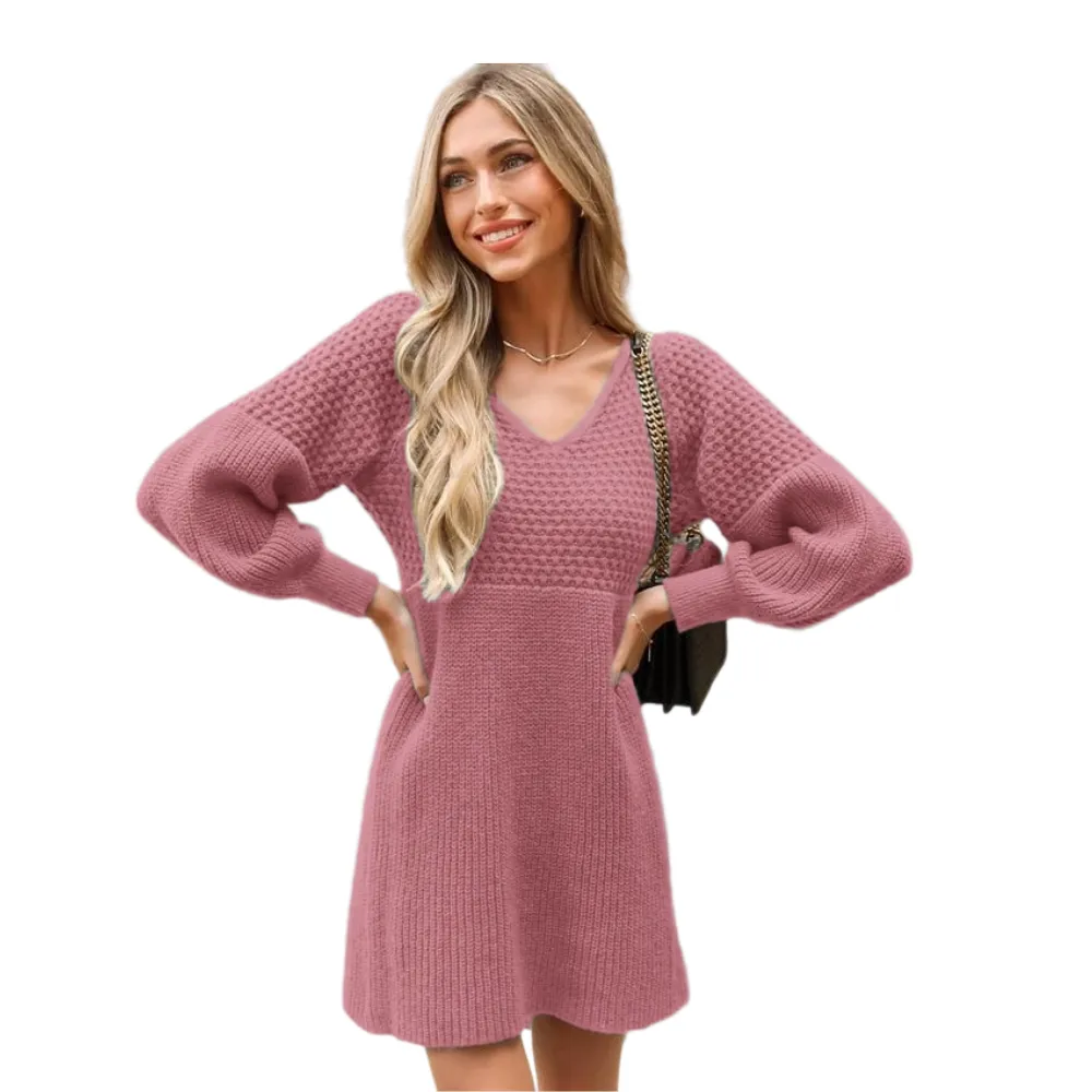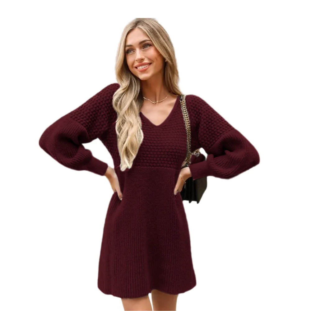 The intricate honeycomb knit pattern, combined with the flattering V-neck design, brings a touch of allure to this mini dress, making it a delightful choice for embracing cozy chic vibes during fall.